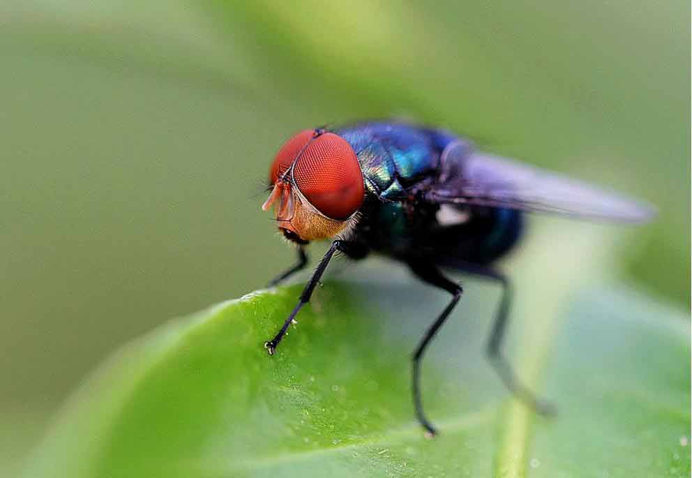 蒼蠅(House Fly)(飛行高手) 生活習性:屬於雜食性蠅類,可以取食各種物質,可以取食各種物質,如人的食物、人和畜禽的分泌物和排泄物、廚房殘渣和其他垃圾以及 植物的液汁等形態特征:體型小型到中型,觸角短,僅 3 節,末節末端有節鞭或末節背麵有一根羽狀剛毛,稱觸角芒(arista)。 複眼2隻,單眼3隻。口器為舔吸式。前翅膜質,用來飛翔,後翅退化為平衡棒(halter),隱於前翅基部的翅瓣下危害:蒼蠅的食性非常複雜,屬於雜食性蠅類,可以取食各種物質,如人的食物、人和畜禽的分泌物和排泄物、廚房殘渣和其他垃圾以及 植物的液汁等。家蠅飽食之後,間隔很短時間(幾分鍾),即可排糞,由於吐瀉、排糞頻繁,失水較多,又促使其頻繁取食,因而蒼蠅在 孳生物質上邊吃、邊吐、邊排,造成嚴重汙染。在畜禽場裏,飼料及飲水器具常被其汙染。 蒼蠅能夠傳播 50 種疾病,其中對畜禽養殖有影響的重要疾病如禽流感、新城疫、口蹄疫、豬瘟、禽多殺性巴氏杆菌病、禽大腸杆菌病 球蟲病等,在疾病暴發時蒼蠅可加速流行性疫病的傳播。