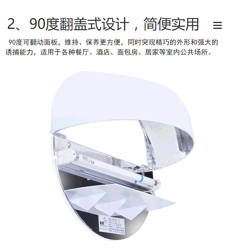 該燈顛覆了傳統格闌珊式電擊滅蠅燈高壓電流裝置,不產生電弧、火花,工作安靜外觀大方,捕蟲效果更出眾.