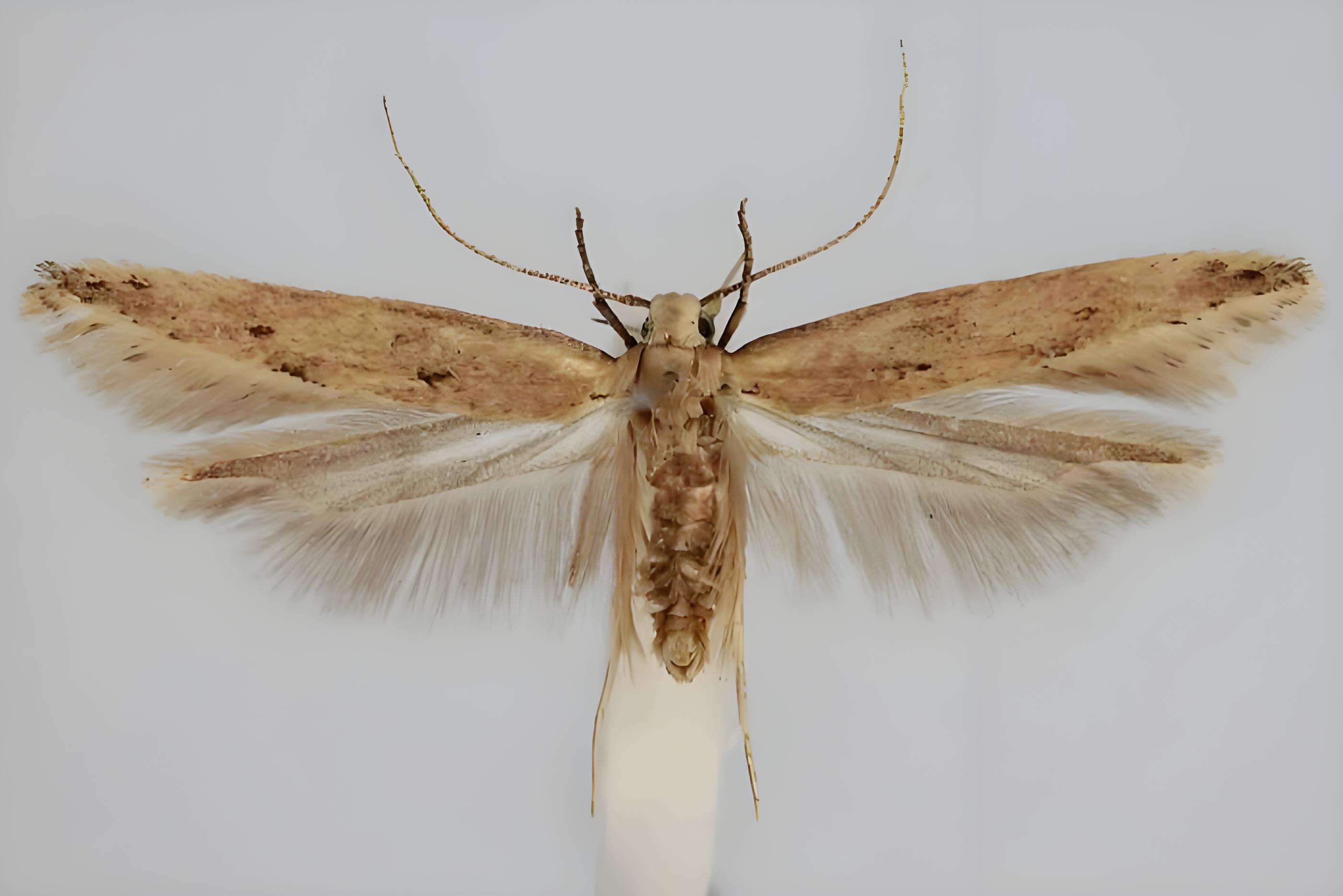 米織蛾(米淡墨蟲)Anchonomaxeraula Meyrick 成蟲體長10-12mm,翅展20-28mm。成熟幼蟲體長 22-23mm,寬2-2.5mm。前翅寬條形,翅頂橢圓,下唇 須尖長上舉,褐色,中小型的小蛾類昆蟲,幼蟲喜蛀食大米並吐絲綴糧食碎屑成巢。