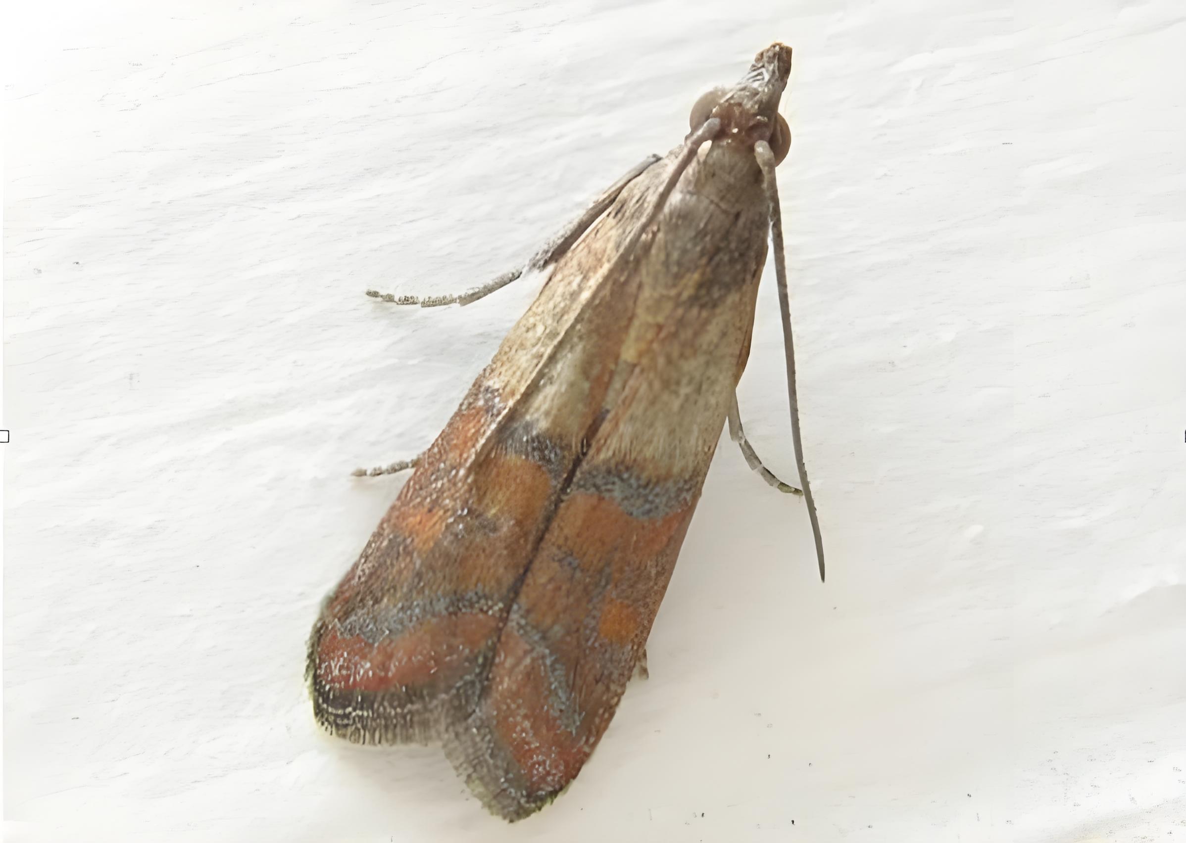印度穀螟Plodia interpunctella(Htibner) 體長6—97mm,翅展13—18mm,蟲體密被赤褐 色和灰褐色鱗片。 額前具有錐狀鱗片脊:前翅長三角形,在亞基線和近中橫線之間為灰黃色。其餘赤褐色,並散生紫黑色小斑點:後翅灰白色。