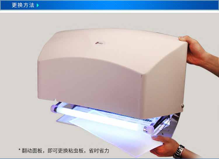 粘蠅板更換簡單,不需要擔心蚊蠅會掉下來,掉在了食品裏,也無需擔心粘紙會壞,撕下的粘紙放在燈裏可長達3個月之久,不影響粘性。燈也可以用於特殊環境的車間,燈管不易爆裂。