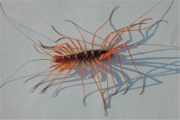 花蚰蜒Theteuonema tuberculataWood 體較小,約25毫米長,背板11塊中有8塊蓬 大其他小。2-8背(bei)板(ban)後(hou)中(zhong)央(yang)開(kai)氣(qi)門(men)。色(se)灰(hui)綠(lv),背(bei)和(he)步(bu)腋(ye)上(shang)都(dou)有(you)斑(ban)紋(wen)。左(zuo)右(you)小(xiao)眼(yan)密(mi)集(ji),宛(wan)如(ru)複(fu)眼(yan)。上(shang)唇(chun)分(fen)三(san)葉(ye),中(zhong)央(yang)部(bu)分(fen)甚(shen)小(xiao)。下(xia)顎(e)二(er)對(dui)有(you)長(chang)須(xu)。第(di)右(you)對(dui)下(xia)顎(e)具(ju)有(you)辱(ru)節(jie),毒(du)顎(e)很(hen)大(da)。下(xia)唇(chun)二(er)基(ji)節(jie),前(qian)左(zuo)二(er)葉(ye)的(de)前(qian)緣(yuan)有(you)長(chang)刺(ci),觸(chu)角(jiao)和(he)肛(gang)腳(jiao)細(xi)長(chang),約(yue)近(jin) 長二倍,步肢15對(連肛腳),近體3節間有棘 後跗節細長多分節,缺爪,易斷。生殖器第17節端開口,雌性有一分叉的突起,雄性有2對起,捕食小蟲。
