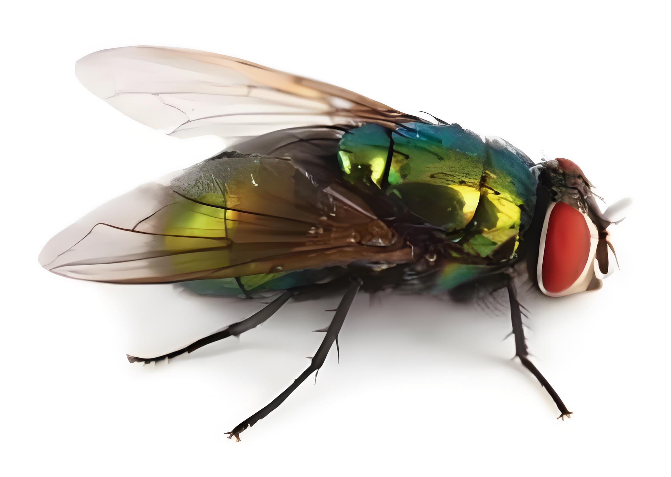 絲光綠蠅(*Lucilia sericata*),體長6-10mm,體表呈金屬綠或藍綠色,複眼紅色。