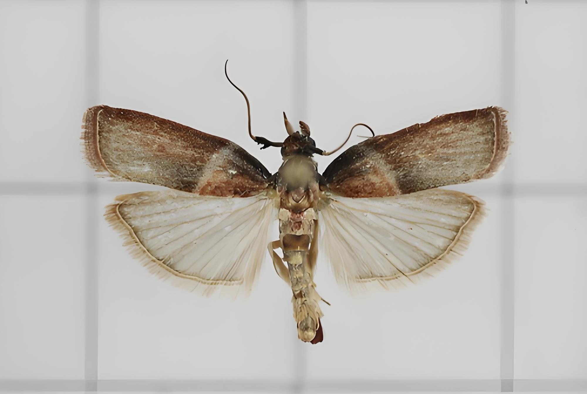 粉斑螟Ephestia cautella(Walker) 體長6—7mm,翅展14—16mm,灰黑色;額前 無錐狀鱗片脊; 前翅三角形,灰黑色,靠近翅基部 1/3處有一條淡白色較寬且直的橫帶紋,在亞緣線 處有時也有一條淡色波狀橫紋;後翅灰白色。 常見於進口食品貨物中,是儲存的穀物、堅果、 幹果、油籽及油餅等的首要害蟲。