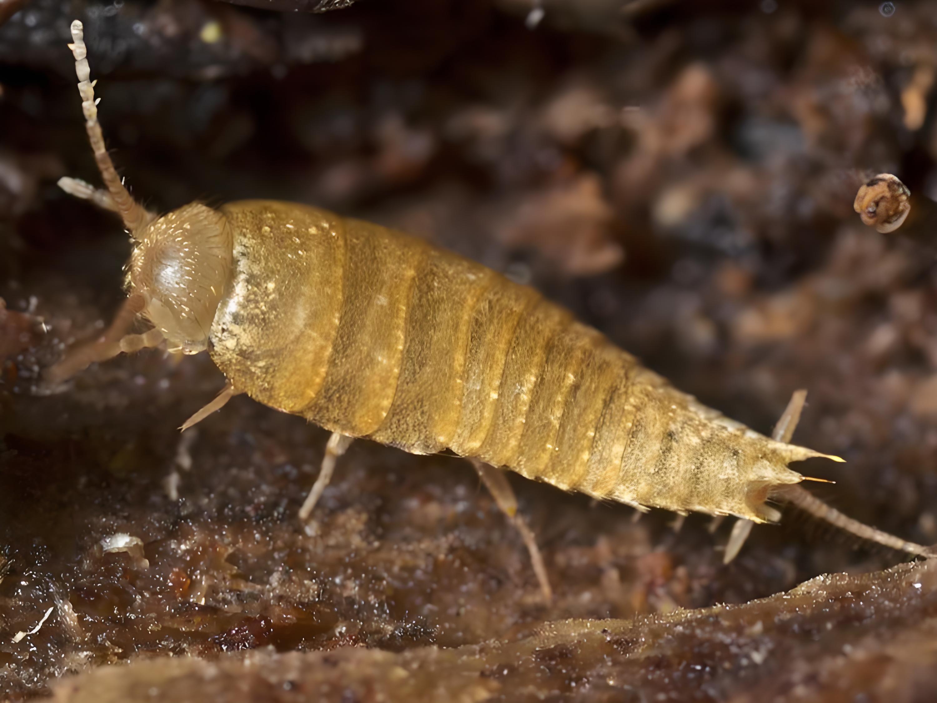 土衣魚Nicoletiidae 體長10-11.5mm,土衣魚是自由生活的種類,數量和 種類都不多,屬於較為少見的類群。 土(tu)衣(yi)魚(yu)身(shen)體(ti)上(shang)沒(mei)有(you)鱗(lin)片(pian)覆(fu)蓋(gai),因(yin)此(ci)多(duo)為(wei)白(bai)色(se)或(huo)米(mi)黃(huang)色(se)。有(you)時(shi)會(hui)與(yu)雙(shuang)尾(wei)蟲(chong)混(hun)淆(xiao),但(dan)仔(zai)細(xi)留(liu)意(yi)的(de)話(hua),土(tu)衣(yi)魚(yu)腹(fu)部(bu)帶(dai)有(you)三(san)根(gen)尾(wei)狀(zhuang)物(wu),而(er)雙(shuang)尾(wei)蟲(chong)則(ze)隻(zhi)有(you)一(yi)對(dui)尾(wei)突(tu)。 生活在土壤枯枝落葉中。